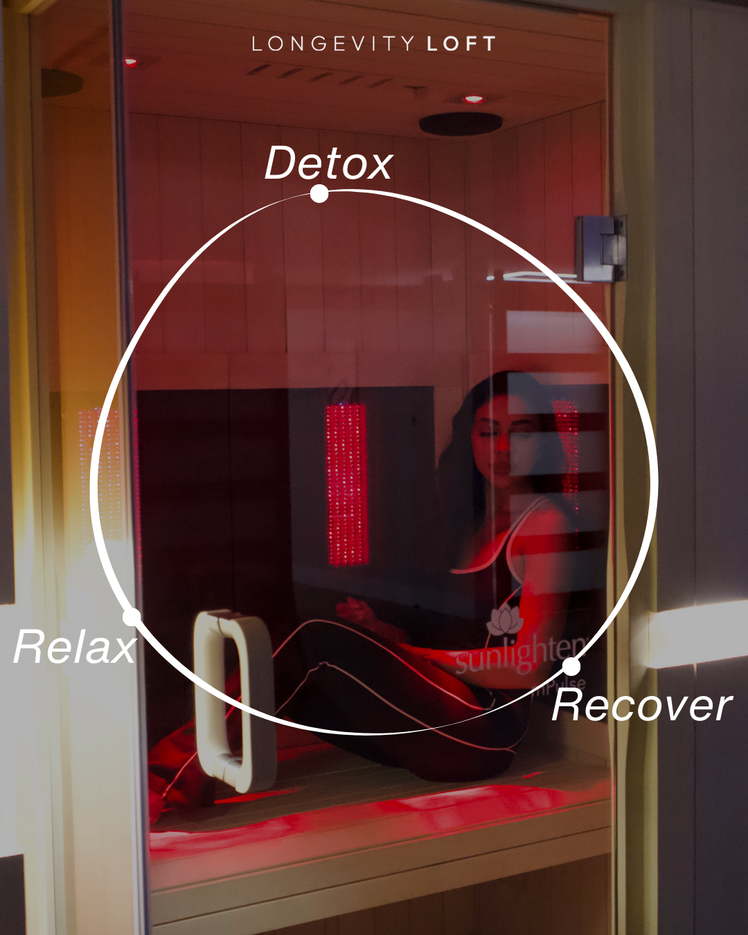 A client relaxes inside an infrared sauna, immersed in gentle heat and red light within a calm, private space designed to support relaxation, recovery, and overall wellness.